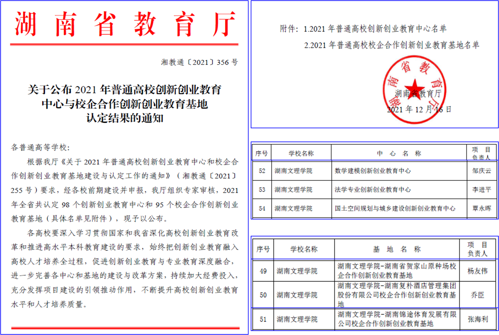 根据湖南省教育厅《关于2021年普通高校创新创业教育中心和校企合作创新创业教育基地建设与认定工作的通知》(湘教通[2021]255号)文件精神,我校各学院积极申报,创新创业学院组织专家进行评审后向省厅推荐了3个创新创业教育中心和3个校企合作创新创业教育基地。经教育厅组织专家审核后,于12月16日下发了认定结果的通知,我校数学建模创新创业教育中心、法学专业创新创业教育中心、国土空间规划与城乡建设创新创业教育中心被认定为“湖南省2021年普通高校创新创业教育中心”;湖南文理学院-湖南省贺家山原种场校企合作创新创业教育基地、湖南文理学院-湖南复朴酒店管理集团股份有限公司校企合作创新创业教育基地、湖南文理学院-湖南锦途体育发展有限公司校企合作创新创业教育基地被认定为“湖南省2021年校企合作创新创业教育基地”。(一审 易姣 二审 杨静 三审 袁勇军)